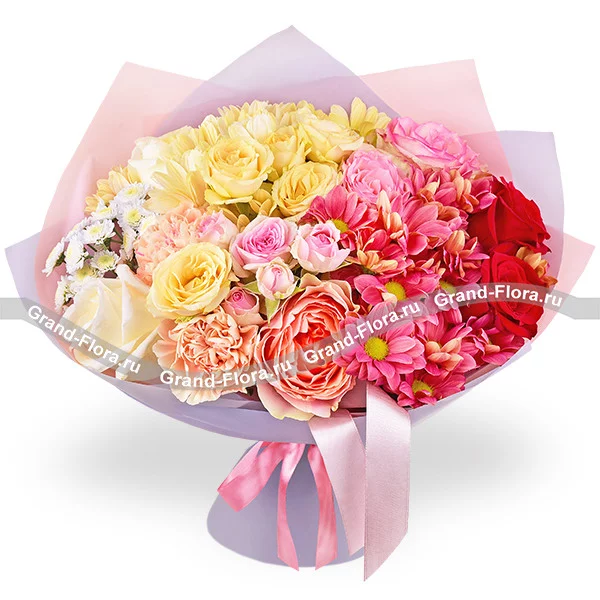 Уменьшенный: роза красная - 1 шт., роза розовая - 1 шт., роза белая - 1 шт., хризантема кустовая розовая - 1 шт., роза кустовая розовая - 1 шт., кустовая роза кремовая - 1 шт., хризантема сантини - 1 шт., гвоздика персиковая - 2 шт., упаковка, лента.