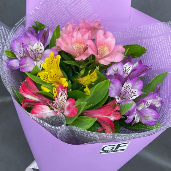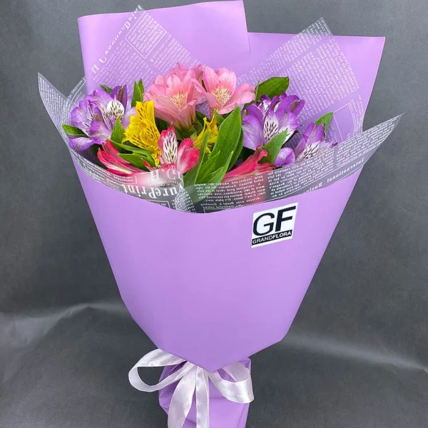 Букет состоит из альстромерии, которую еще называют перуанской лилией из-за внешнего сходства, разнообразное цветовое сочетание, в окружении декоративной зелени. Диаметр букета от 25см до 50см, в зависимости от выбранного варианты букета.  Букет перевязан изящным розовым бантом. Обращаем Ваше внимание, что состав и оформление букета может отличаться.